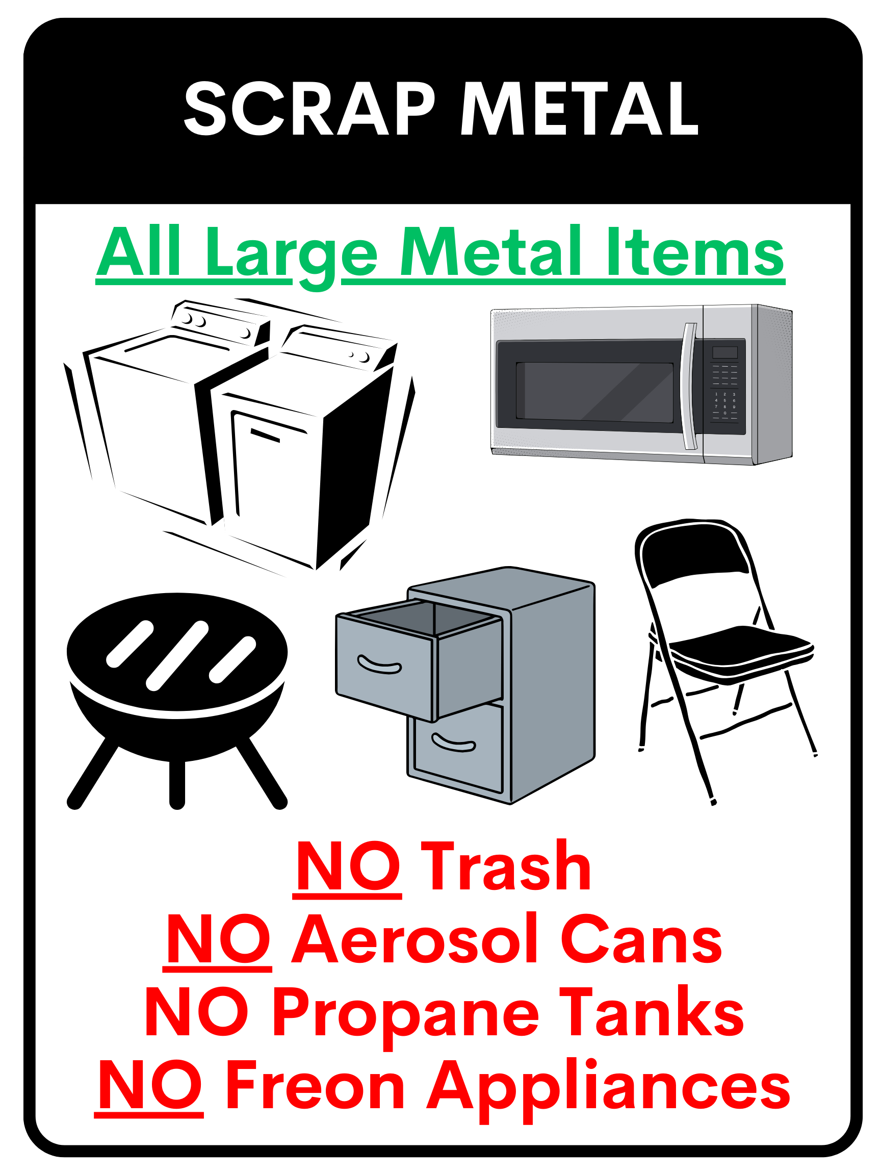 Scrap Metal: Metal Household Items and Decor, Metal Bed Frames, Microwaves (Throw Away Glass Plate), Grills (No Tanks), Pots and Pans, Tire Rims (No Tires), Stove, Washer/Dryer, Metal Pipes, Metal Fence/Posts, Barbed or Chicken Wire (No Large Bails), Lawn Mowers (No Fluids), Metal Furniture, Metal Toys, Metal Swing Sets, Dishwasher, Household Appliances (Toasters, Blenders, Etc.), Vacuums, Fans, Water Heaters (Drained), Metal Auto Parts (Fluids Drained), Furnaces, and Exercise Equipment