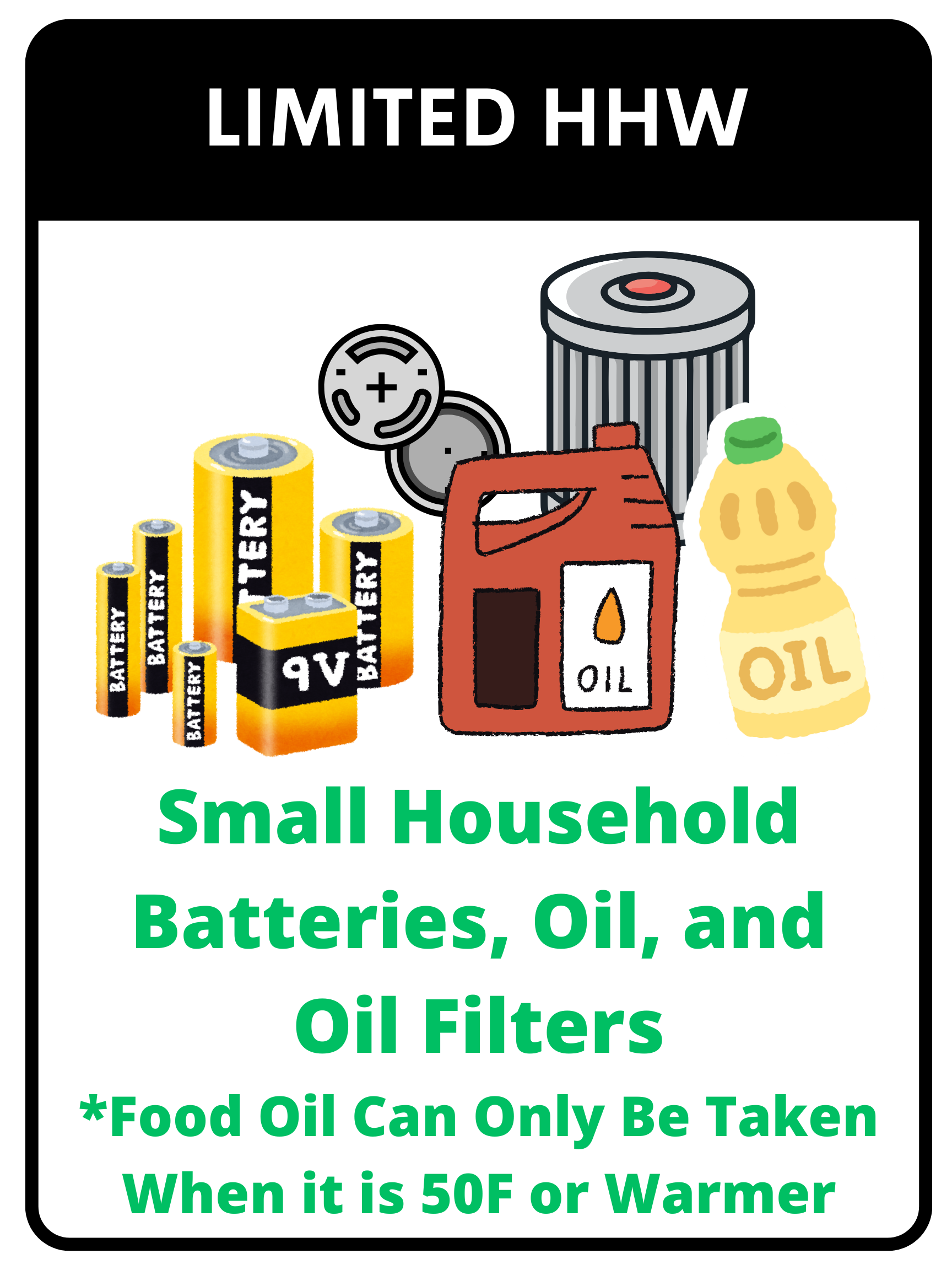 Limited HHW: Small Household Batteries, Used Car Oil and Filters, Food Oil (Average Temperature Must Be Warmer Than 50F Outside), and Antifreeze
